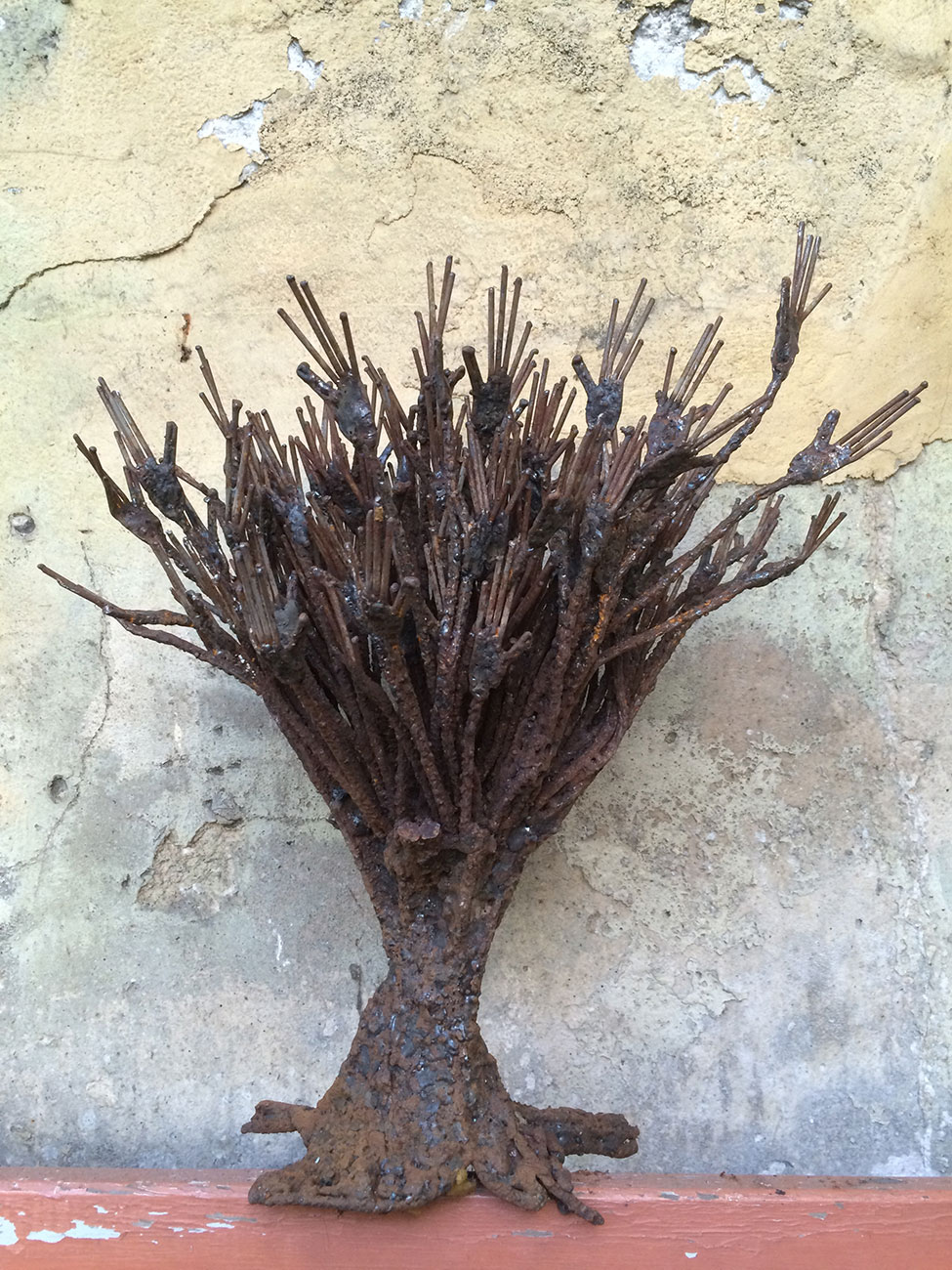 Emblème du Sénégal et omniprésent dans l’imaginaire collectif africain, l’arbre est le symbole essentiel de la vie, de la nature et de la sagesse. Giacometti et nombre d’artistes modernes ont été influencés par la sculpture africaine dès les années ‘20. C’est au tour de Ndary Lo de s’approprier cet héritage culturel et de représenter sa propre image longiligne dans ces Arbres des origines. Ces compositions végétales humanisées, où l’homme puise toute son énergie des racines mêmes de la nature, sont un cri d’alarme qui plaide pour plus d’engagement et de responsabilité face un environnement matériel.